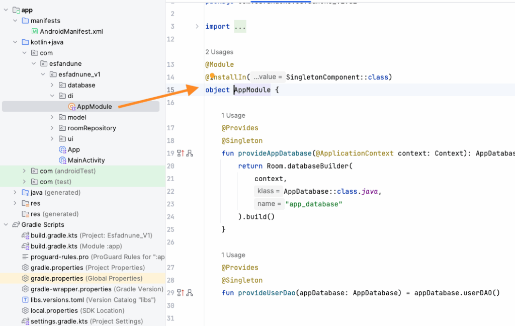 • یه object بسازید و بهش @Module و @InstallIn(SingletonComponent::class) بدید.