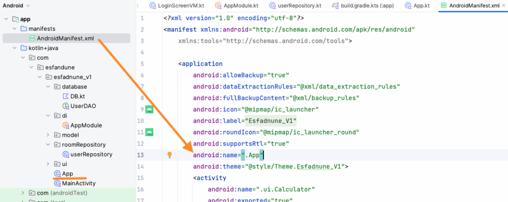 • بعدش اسم این کلاس رو توی فایل AndroidManifest.xml معرفی کنید.