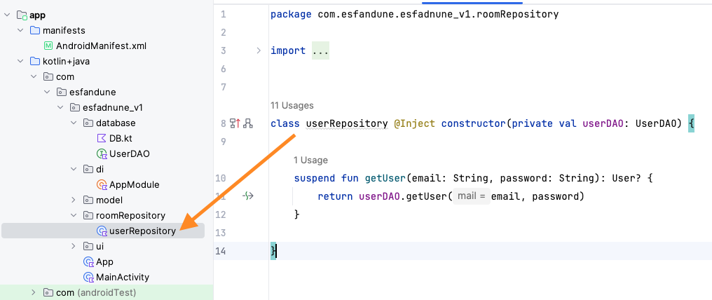 یه کلاس Repository (مثلاً UserRepository) بسازید. این کلاس مسئول ارتباط با دیتابیس Room هست.